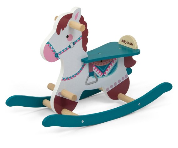 Drewniany konik posiada rączki przy głowie, oraz dodatkowy podnóżek dla najmłodszych, który pomoże zachować równowagę podczas zabawy.