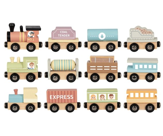 Zestaw drewnianych wagoników i lokomotyw od Tooky Toy to idealna zabawka dla małych miłośników pociągów. Komplet składa się z 13 kolorowych elementów, które można dowolnie łączyć dzięki wbudowanym magnesom. Całość zamknięta jest w estetycznym, drewnianym pudełku z półkami, które służy jednocześnie jako organizer i wystawka dla małej kolekcji.
