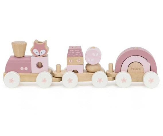 Zestaw składa się z 3 wagoników oraz 13 kolorowych klocków o różnych kształtach i rozmiarach. Dziecko może tworzyć dowolne kombinacje, budując za każdym razem inny pociąg. Drewniane elementy są starannie wyszlifowane, idealnie dopasowane do małych rączek i pomalowane bezpiecznymi, nietoksycznymi farbami w przyjemnych odcieniach różu, bieli i naturalnego drewna.