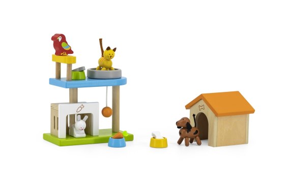 Zestaw składa się z 4 drewnianych figurek przedstawiających zwierzęta domowe (pies, kot, królik, papuga), akcesoria do karmienia (miski i pokarm) oraz spania (buda dla psa, domek dla królika, legowisko dla kota i drążek dla papugi). Zabawka sprzyja poznawaniu kolorów, kształtów, gatunków zwierząt oraz zachowań i zwyczajów dla nich charakterystycznych. Zapewnia szeroki wachlarz możliwości zabawy i tworzenia nieograniczonych ilości historii i scenek z odgrywaniem postaci.