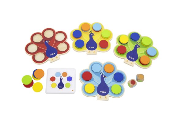 Gra zręcznościowa- dopasowanie kolorów polega na umieszczaniu krążków w ogonie pawia zgodnie z instrukcjami znajdującymi się na kartach lub uzupełnieniu otworów według kolorów wyrzuconych kostką. Zabawa ta pomaga w nauce kolorów, rozwijać małą motorykę oraz koordynację wzrokowo- ruchową u dziecka poprzez połączenie zabawy z nauką. Wspólna zabawa jest czymś co najlepiej rozwija tak ważną w tym wieku wyobraźnię, jednocześnie doskonale przygotowuje dziecko do przyszłej edukacji przedszkolnej.