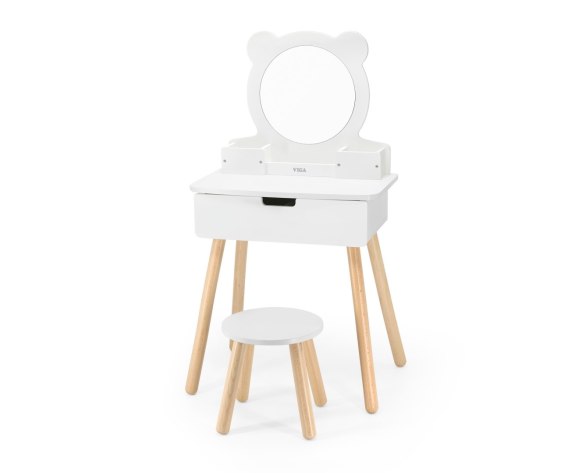 Każda mała dziewczynka naśladuje swoja mamę i chętnie będzie korzystać z tej uroczej drewnianej toaletki z lustrem i stołeczkiem miejsce do pielęgnacji oraz wykonania makijażu.