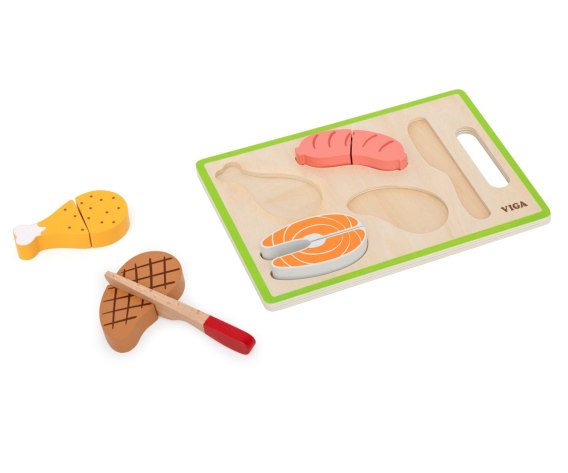 Zestaw Viga 44791 Zabawa w krojenie - mięso to doskonała propozycja dla małych kucharzy, którzy lubią naśladować dorosłych w codziennych czynnościach. Drewniany komplet składa się z deski do krojenia, bezpiecznego nożyka oraz różnorodnych elementów przedstawiających produkty mięsne i rybne, takich jak stek, udko z kurczaka, filet z łososia czy kiełbaska.