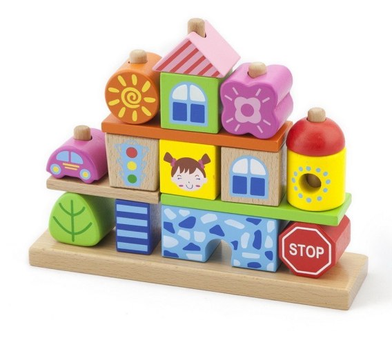 Viga prezentuje klocki które trochę ułatwią ustawienie stabilnej konstrukcji- dzięki kołeczkom na które należy nałożyć każdy element. Dziecko włoży więcej wysiłku aby precyzyjnie ułożyć klocki, nie zniechęci się gdyż klocki się nie przewrócą. Klocki można układać na podstawie, lub niezależnie - na samych bolcach- co sprawi iż nasza budowla będzie ruchoma...
