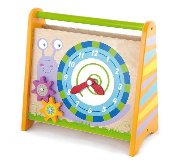 Pierwsza strona zabawki to kolorowy ZEGAR, obracając kolorowymi zębatkami Maluszek może poznawać czas - godziny i minuty, gdzie dzieckooperuje ręka/ oko pobudzając u siebie rozwój umysłowy i manualny.