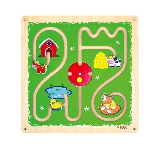 Labirynt - życie na farmie od firmy VIGA to edukacyjna tablica manipulacyjna, rozwijająca zdolności logicznego myślenia u dzieci. Tablica wspomoże rozwój dziecka, koordynację ręka-oko, logiczne myślenie, wzbogaci wyobraźnię i zachęci do opowiadania historyjek oraz nauki wierszyków. Tablica przedstawia labirynt - farmę. Posiada 4 ruchome zwierzątka, zadaniem dziecka jest dopasowanie zwierzątek do poszczególnych miejsc, poruszając się po labiryncie. Pośrodku planszy znajdują się „drzwi obrotowe", które pozwalają jednocześnie na spacer zwierzątek po całej farmie.