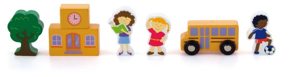 Zestaw figurek zawiera - drzewo, budynek szkolny, nauczycielkę, autobus, chłopca, dziewczynkę.
